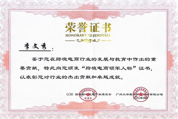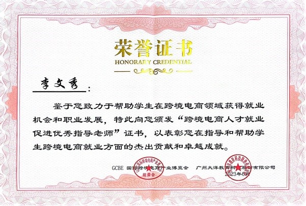 图4:李文秀获“跨境电商领军人物”、“跨境电商人才就业促进优秀指导老师”证书