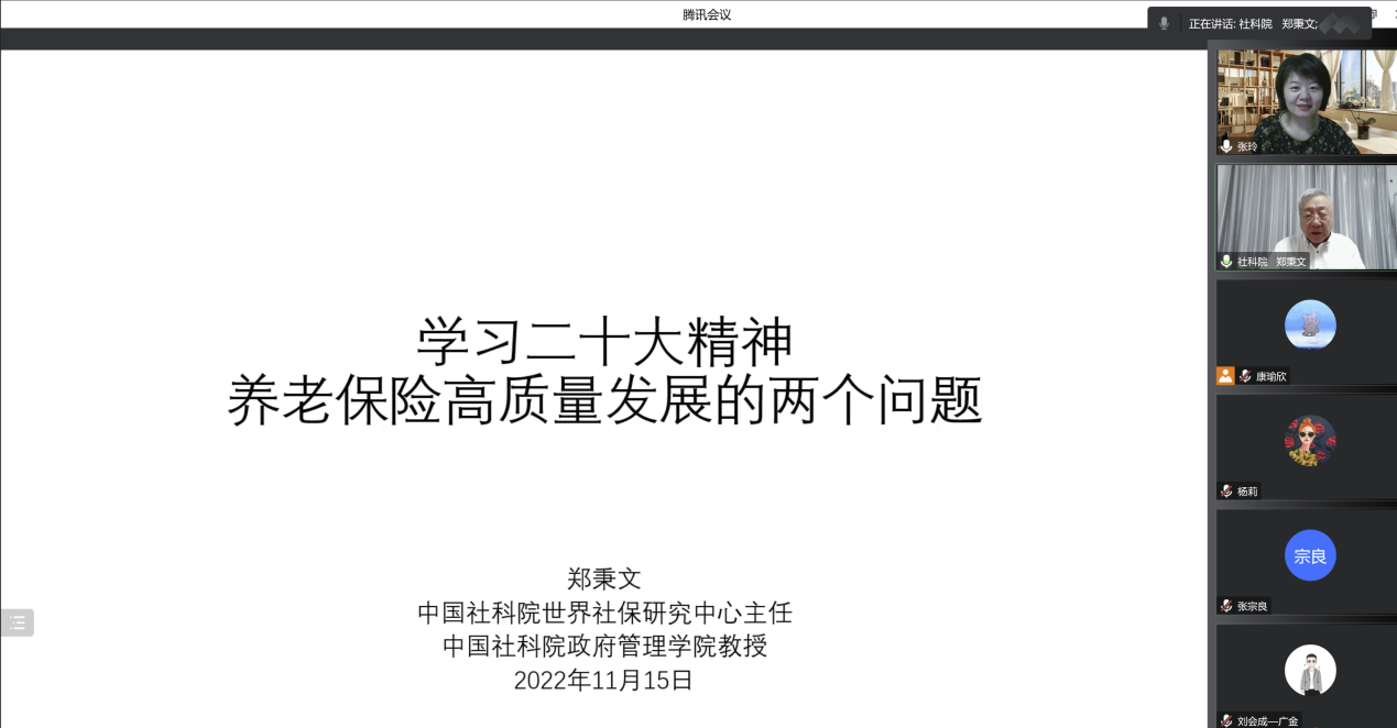 11月15日,全国政协委员、中国社会科学院政府管理学院郑秉文教授做客我校“国家金融学大讲坛 ”(第六讲),做了主题为“学习二十大精神,养老保险高质量发展的两个问题”的精彩报告。本次报告由我校久久久人妻张玲教授主持,报告吸引了大量在校内本科生、研究生、教师的积极参与,来自全国数十所高校的师生以及金融机构从业人员近三百人参加了此次报告。