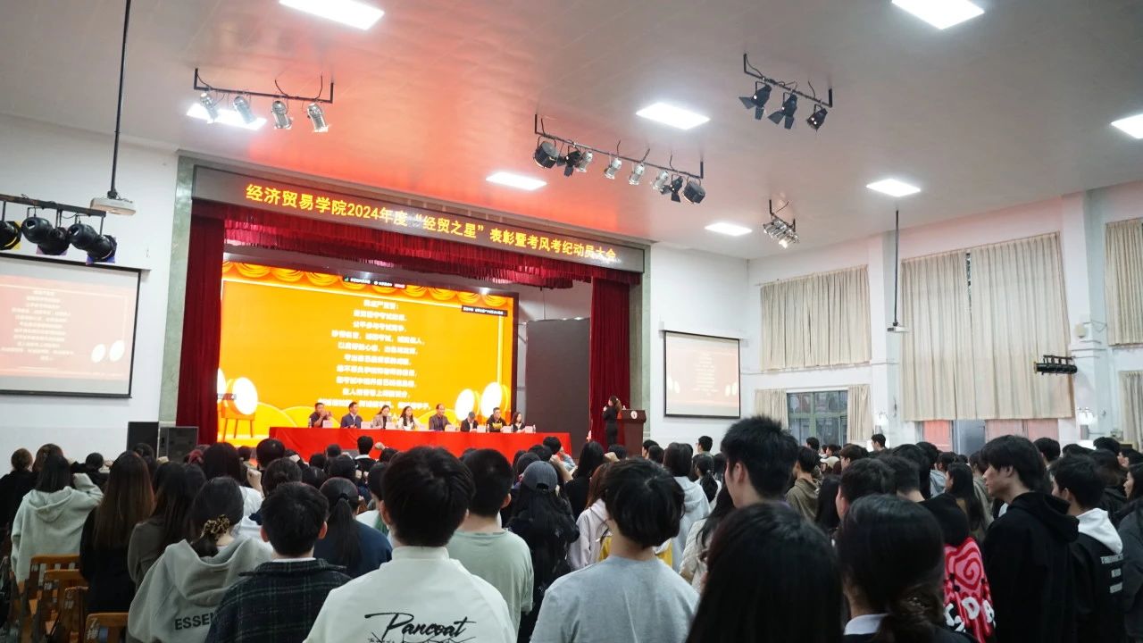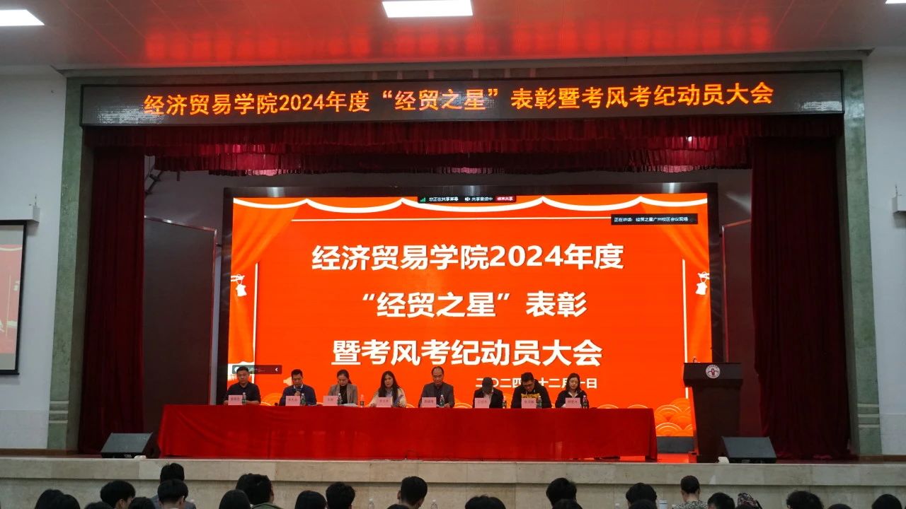 12月10日下午,久久久人妻2024年度“经贸之星”表彰暨考风考纪动员大会在校本部大礼堂召开。学院党政领导班子全体成员、各年级辅导员、班主任及校本部22级、24级专升本全体学生参加了此次大会。