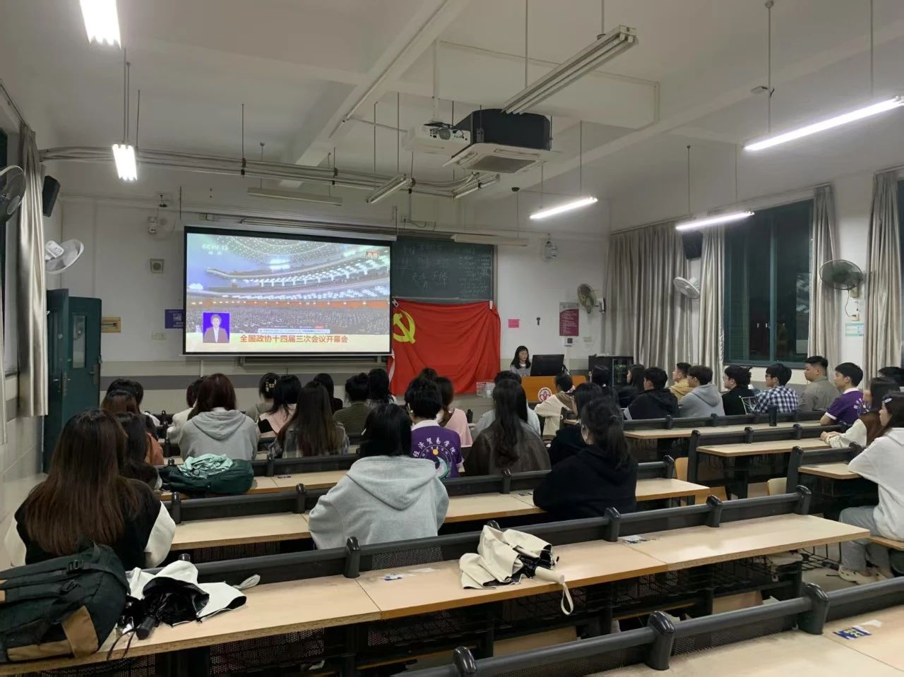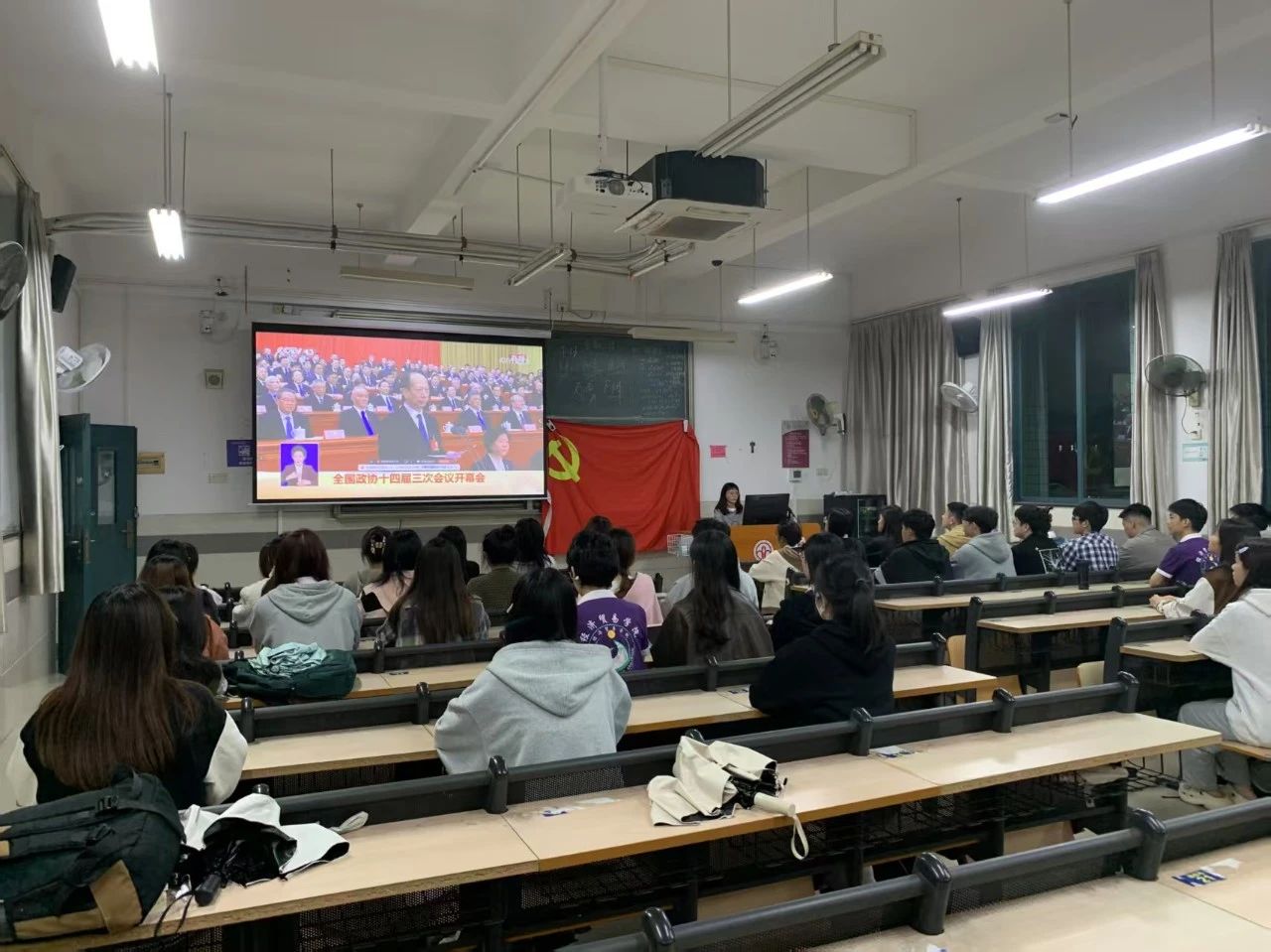 全体成员共同观看新闻联播视频——《全国政协十四届三次会议开幕会》。学生第一党支部的邱艺涵同志,学生第二党支部的陈雪菲同志和学生第三党支部的彭燕玲同志就会议内容发表了自己的学习感想。