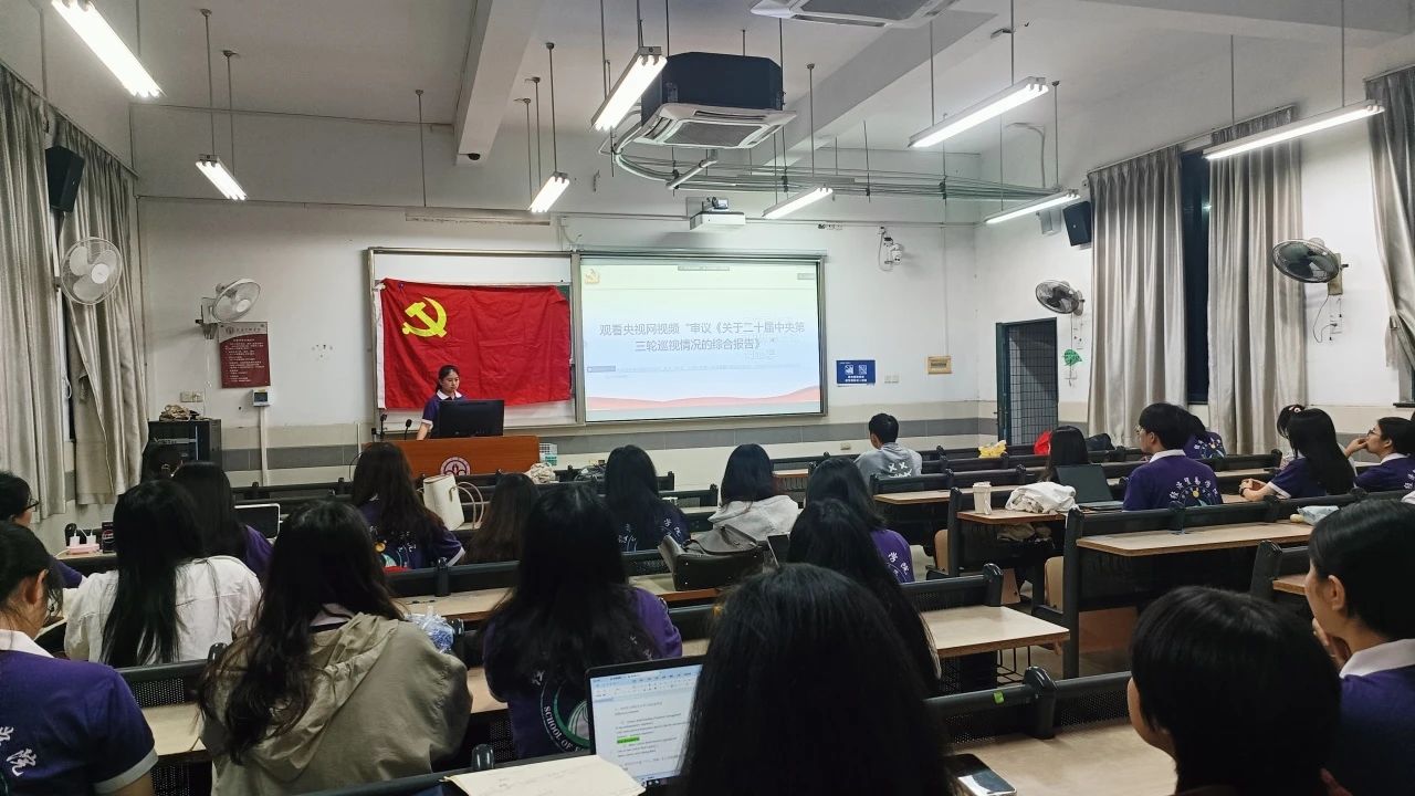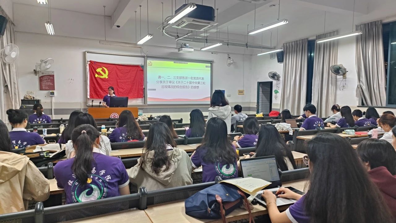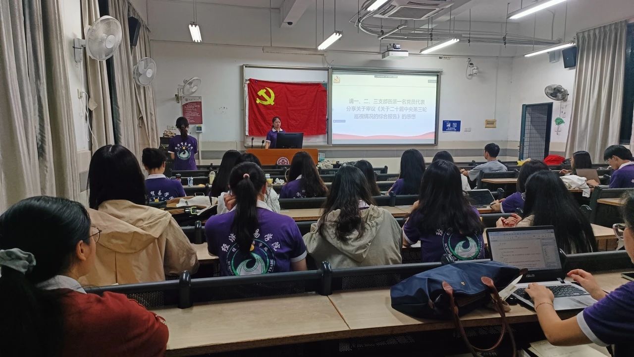 会议由学生第二党支部的谢泽微同志主持。首先,主持人带领全体成员一起观看学习视频——“审议《关于二十届中央第三轮巡视情况的综合报告》”。