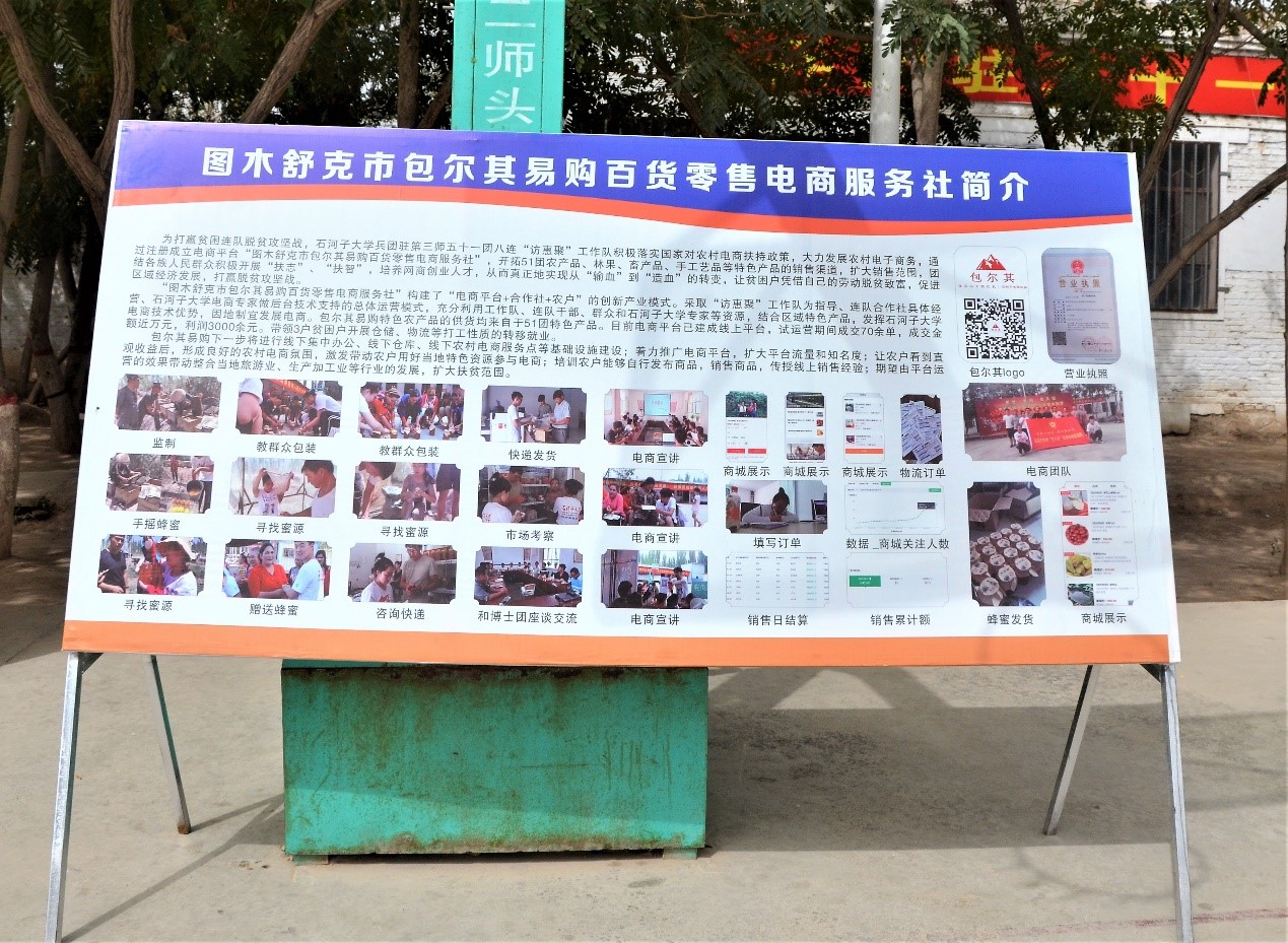 在51团,队员们来到了8连,51团8连“访惠聚”工作队第一书记、石河子大学经管学院党委副书记范君旗向队员们详细介绍了已经初具雏形的图木舒克市包尔其易购百货零售电商服务社。该电商平台是连队与新疆石河子大学合作推出,只做纯天然的南疆土味特产专销;销售的商品随着季节变化,春天卖蜂蜜、夏天卖瓜果、秋田卖干果、冬天卖羊肉;而销售模式是直销型的“电商平台-合作社-农户”。