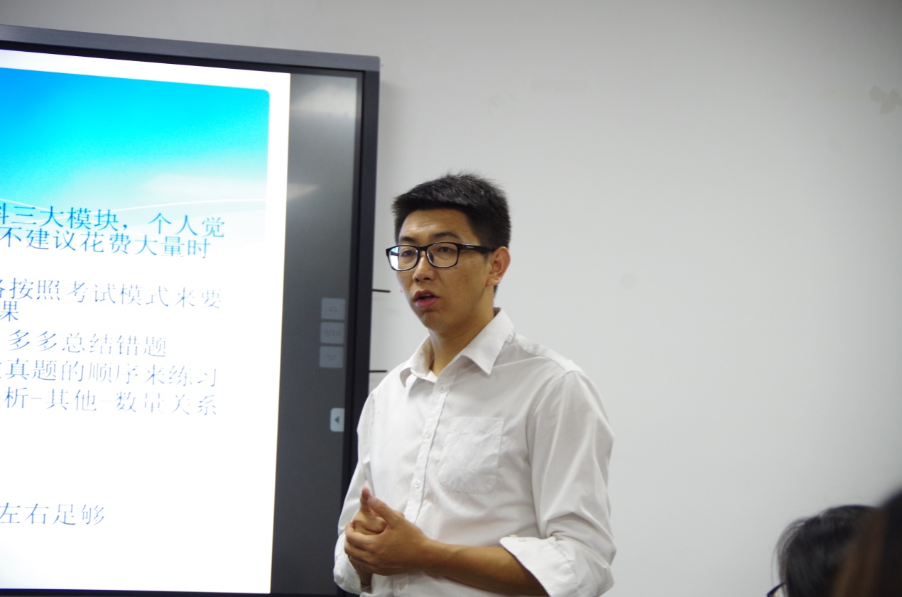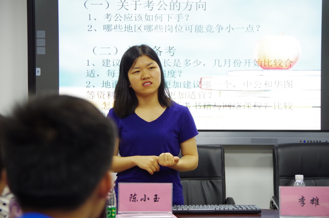 分享会的第二环节是14级的优秀毕业生陈小玉师姐的分享。师姐首先指出在考公的方向性上要视自己的兴趣和专业知识而定。同时师姐建议大家在备考前先测试一下自己的水平然后根据特点去安排复习备考。面对大家普遍感到疑惑的秋招和国考的问题以及考去哪里的问题,陈小玉师姐都以自身经历做出了解答。