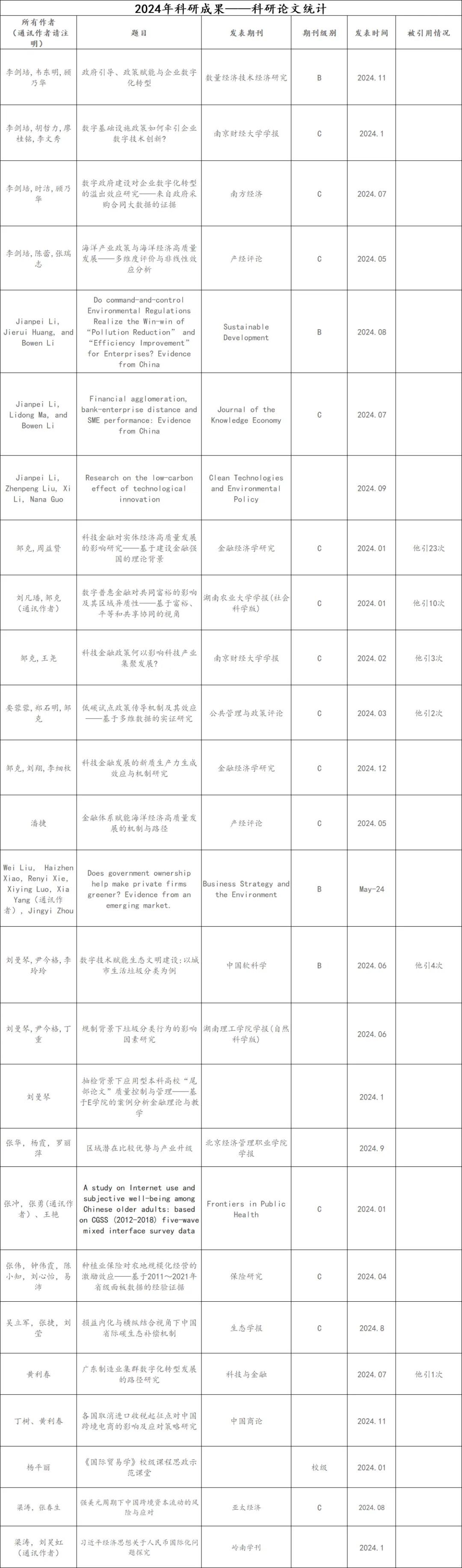经济贸易学院2024年科研论文展示