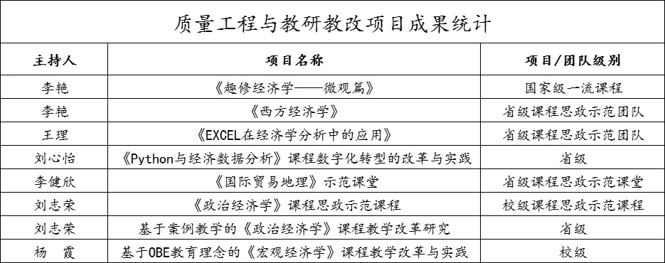 近年来,学院全体教职工以立德树人为根本任务,以培养高素质复合型人才为己任,凝心聚力、创新发展,为建设有特色的高水平经贸学院和打造广东省一流经济学科而努力奋斗。学院现建有1门国家级一流课程《趣修经济学》、1门省级一流课程《EXCEL在经济学分析中的应用》,拥有《经济学原理》、《政治经济学》2个省级教学团队,还开设有《走遍世界说贸易》、跨境电商第二课堂《亚马逊运营思维与实操策略》、《企业家讲经济》等产教融合特色课程,以及4门线上线下混合式课程;教学质量稳步提高,在广东省第一届高校青年教师教学基本功大赛中获得2等奖1次,在广东省高校青年教师教学大赛中有2人获得一等奖、3人获得二等和三等奖,在广东省本科高校在线教学优秀案例比赛中有3人获得一等奖、1人获得二等奖。