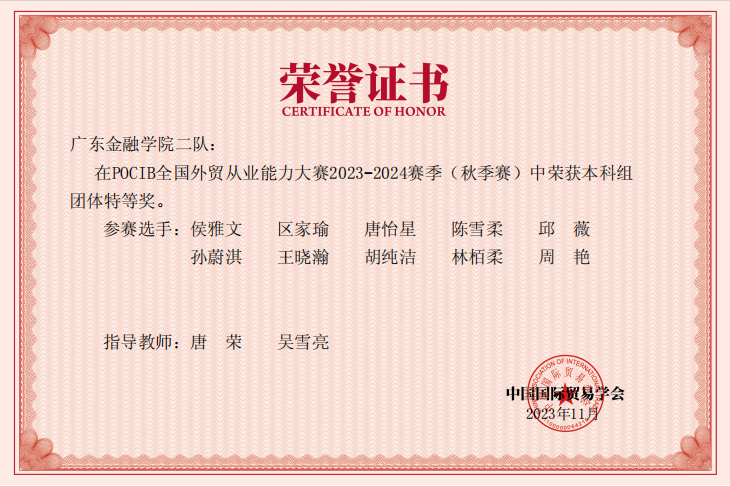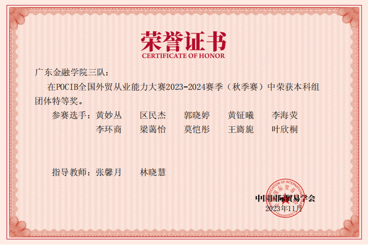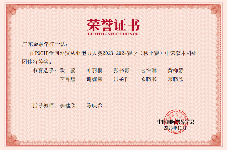 在本次比赛中,我院国际经济与贸易专业30名同学组成的三支队伍,在林晓慧、李健欣、陈映希、吴雪亮、张馨月、唐荣六位老师的指导下,荣获全国团体特等奖3项、个人一等奖8项、个人二等奖13项、个人三等奖9项。这充分展现了我院国贸专业应用型人才培养的实力。