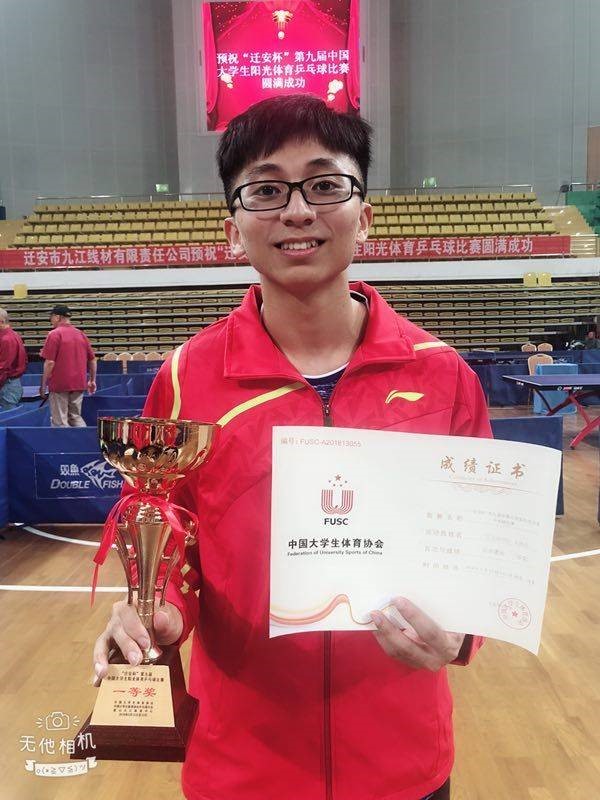 2018年5月13日,由中国大学生体育协会主办、唐山九江体育中心承办的“迁安杯”第九届中国大学生阳光体育乒乓球比赛圆满落幕。经过激励的角逐,我校乒乓球代表队凭借自身实力脱颖而出,最终战胜清华大学获得桂冠!我院吴伟林同学作为参赛队员充分发挥主力作用,在赛场上表现出色,最终拿下比赛的胜利。